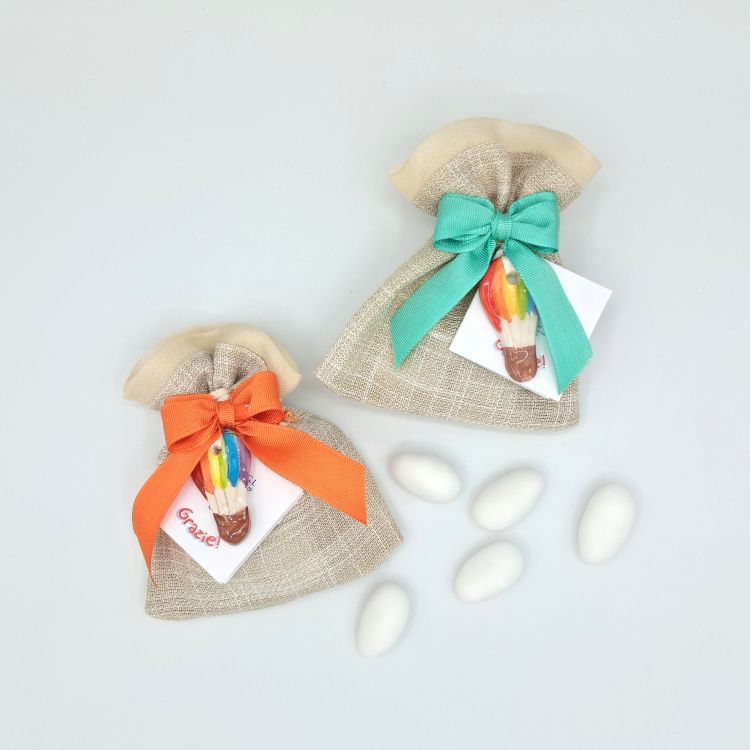 DettagliSacchetto écru in lino (misura 9 x 12 cm circa) con nastro di colori vari, minidépliant e ciondolo ...