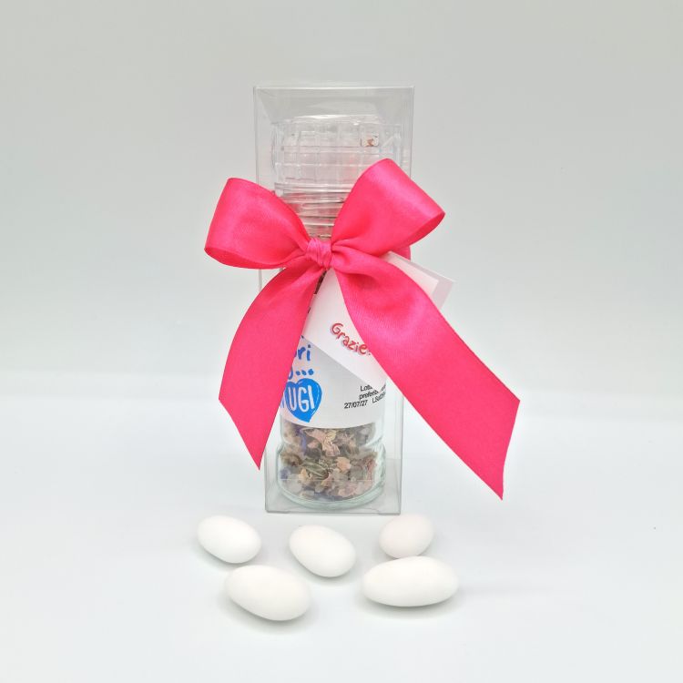 DettagliBarattolino in vetro con tappo ermetico in legno (cm 6x4) contenente n° 5 confetti* a scelta tra tradizionali ...