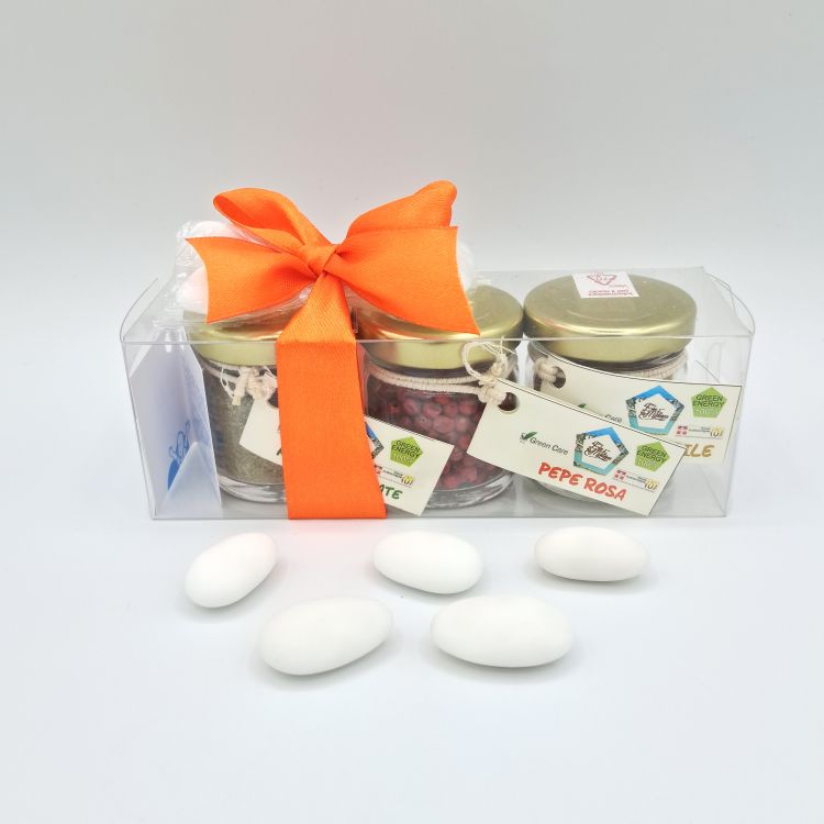 Tris di spezie in vasetti di vetro (pepe rosa 10 g, curry amabile 15 g, misto per patate 10 g) prodotte ...