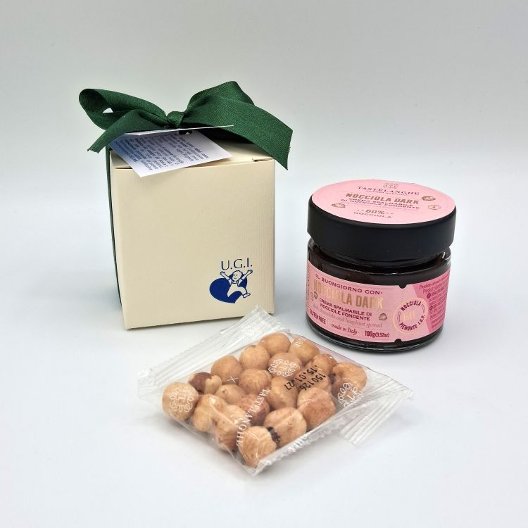 DettagliScatolina di cartone personalizzata con logo (cm 7x6,5x6,5) al cui interno viene inserita la crema spalmabile di ...