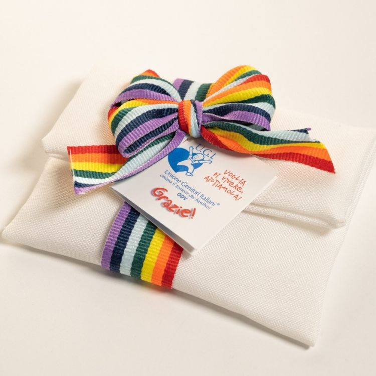 DettagliSpilletta con grafica VIETATO SMETTERE DI SOGNARE confezionata con nastro di vari colori, minidépliant e n° 5 ...