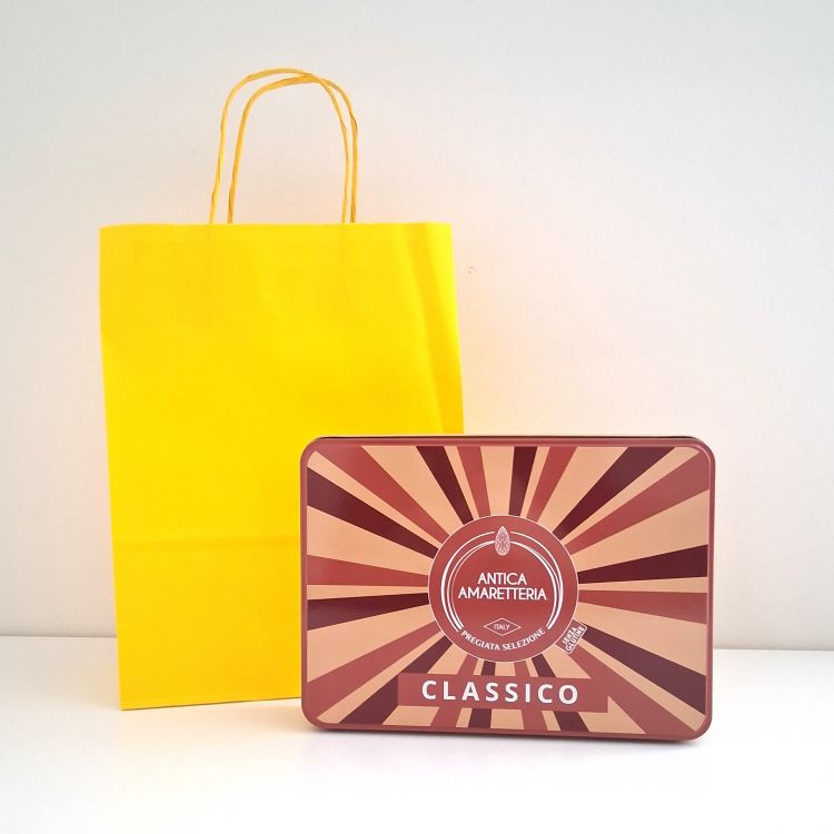 Scatola in latta (cm 21x16x4) contenente amaretti* morbidi alla mandorla Torroneria D. Barbero (Asti) 150 g, ...